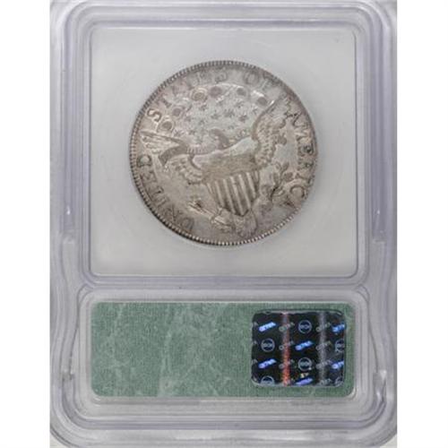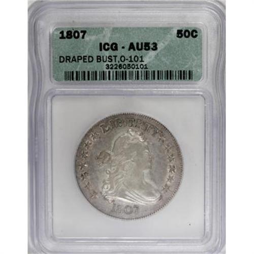 <B>1807 50C Draped Bust AU53 ICG.</B></I> O-101, R.5. Final year of the Fillet Head obverse and Heraldic reverse. The mintage of 301,076 halves was struck using eight obverse dies and six reverse dies, which resulted in 11 different die varieties. This is a single-use obverse that is paired with a reverse that was used twice (on this and O-102). This piece shows the usually seen die crack, described in Overton as, "... from bottom of 1 through lower loop of 8 to edge of 0 and running to left outside of stars." <BR> The surfaces are bright with good portions of mint luster remaining around the devices. The underlying brightness has an overlay of reddish-brown patina that deepens gradually toward the rims. The only noticeable identifier on this piece is a short, horizontal streak over the fourth vertical stripe on the reverse. A bit softly struck on the figure of Liberty.<BR> This piece remains the finest O-101. The top five coins known to Herrman are: 53/53, 45/45, 45/45, 45/45, 40/40.<BR> Beistle 6-Ab, Overton-1, 2, PCGS # 6079, Encyclopedia-4593.<BR><I>Purchased "raw" in 1999 by Robert Zornes; certified the following year; 2001 ANA Auction (Heritage, 8/2001), lot 6104, unsold; afterward sold privately to the present consignor.<BR>From The Westmoreland County Collection of Early Bust Halves, 1794-1807.</B></I><BR><BR><B>Coin Engraver:</B> Robert Scot<BR><BR><b>Shipping:</b> Coins & Currency (<a target="_blank" href="http://www.heritageauctions.com/common/shipping.php">view shipping information</a>)