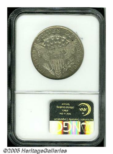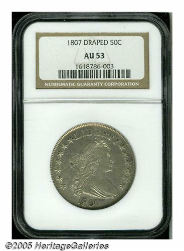 <B>1807<50C> Draped Bust AU53 NGC.</B></I> O-102, R.2. Silvery surfaces display traces of luster in the protected areas. The design elements are well centered on the planchet, and exhibit fairly strong detail. Only portions of Liberty's hair, the star centers on both sides, and the eagle's neck feathers display weakness. A few wispy slide marks are noted on each side, but there are no significant abrasions to report.