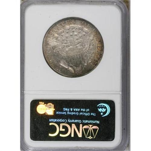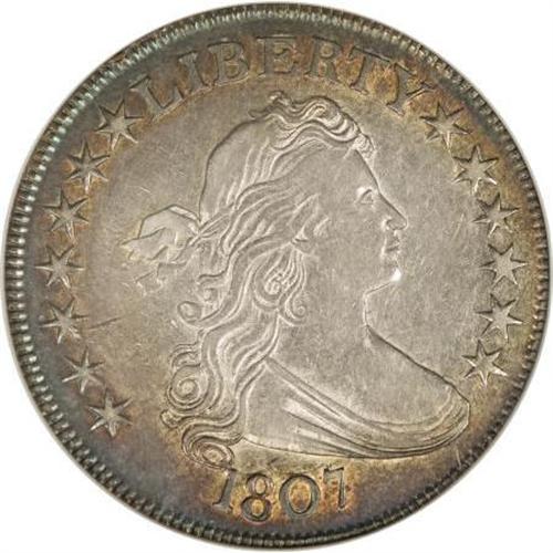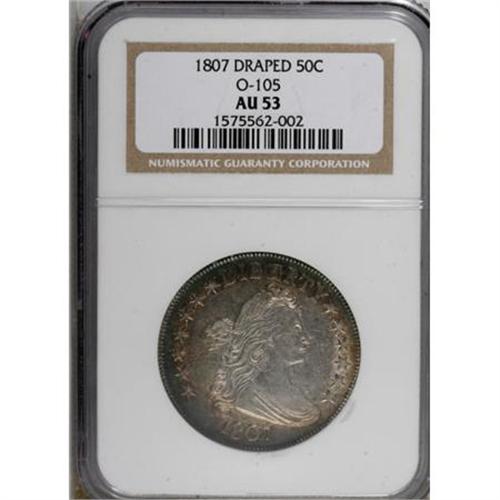 <B>1807 50C Draped Bust AU53 NGC.</B></I> O-105, R.1. Golden-brown and ocean-blue embrace the peripheries of this partly lustrous and lightly abraded final-year type coin. The drapery near the bust tip is well struck, as are the clouds and stars opposite this design highpoint. Struck from multiply clashed dies.<BR><BR><B>Coin Engraver:</B> Robert Scot<BR><BR><b>Shipping:</b> Coins & Currency (<a target="_blank" href="http://www.heritageauctions.com/common/shipping.php">view shipping information</a>)