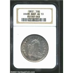 <TABLE cellSpacing=0 cellPadding=0 width="100%" bgColor=#000000 border=0><TBODY><TR><TD width="100%"><TABLE cellSpacing=1 cellPadding=3 width="100%" border=0><TBODY><TR><TD width="100%" bgColor=#79735c><FONT face=arial color=#ffffff size=3><B>Description</B> </FONT></TD></TR><TR><TD width="100%" bgColor=#ffffff><FONT face=arial size=2><B>1807 50C Draped Bust AU53 NGC.</B></I> O-108, R.3. Most easily attributed by the position of star 7 relative to the base of the L in LIBERTY, and the missing right base of the F in OF. The devices are diagnostically blunt, as always seen on this variety, with steely-gray and lilac toning over each side. Much of the original mint luster can still be seen around the devices with no obvious or distracting marks present. Apparently a Condition Census coin for this variety, as the C.C. listed in the third edition of Overton is (60, 50, 45, 45, 40). </FONT></TD></TR></TBODY></TABLE></TD></TR></TBODY></TABLE><BR><A name=PricesRealized></A><TABLE cellSpacing=0 cellPadding=0 width="100%" bgColor=#000000 border=0><TBODY><TR><TD width="100%"><TABLE cellSpacing=1 cellPadding=3 width="100%" border=0><TBODY><TR><TD width="100%" bgColor=#79735c><A name=PR><FONT face=arial color=#ffffff size=3><B>Previous Prices from Heritage Auctions</B> </FONT></A></TD></TR><TR><TD bgColor=#f6f6ed><TABLE cellSpacing=0 cellPadding=0 width="100%" border=1><TBODY><TR><TD align=middle width="33%"><B>Date</B></TD><TD align=middle width="33%"><B>Service</B></TD><TD align=middle width="33%"><B>Price</B></TD></TR><TR bgColor=whitesmoke><TD width="33%"><B>09/28/2002</B></TD><TD width="33%">PCGS</TD><TD width="33%">$2,415.00</TD></TR><TR bgColor=whitesmoke><TD width="33%"><B>11/23/2002</B></TD><TD width="33%">NGC</TD><TD width="33%">$2,012.50</TD></TR><TR bgColor=whitesmoke><TD width="33%"><B>09/21/1996</B></TD><TD width="33%">NGC</TD><TD width="33%">$1,265.00</TD></TR></TBODY></TABLE></TD></TR><TR><TD bgColor=#ffffff><FONT face=arial size=1 ?>PLEASE NOTE: All prices realized reflect the final hammer price PLUS the buyer's premium in auctions that charge a buyer's premium. Each item has a notation at the top of the listing indicating whether that lot included a buyer's premium. Example: A item that sells with a final hammer price of $100 and a 20% buyer's premium will display with a price realized of $120. All information listed is intended to be as accurate as possible, but errors are possible. Please use this guide carefully and inform us of any inaccuracies. </FONT></TD></TR></TBODY></TABLE></TD></TR></TBODY></TABLE><BR><TABLE cellSpacing=0 cellPadding=0 width="100%" bgColor=#000000 border=0><TBODY><TR><TD width="100%"><TABLE cellSpacing=1 cellPadding=3 width="100%" border=0><TBODY><TR><TD width="100%" bgColor=#79735c colSpan=6><FONT face=arial color=#ffffff size=3><B>Price Guide*</B> </FONT></TD></TR><TR bgColor=#f6f6ed><TD align=middle><B>Grade</B> </TD><TD align=middle><B>Coin World<BR>(Trends)</B> </TD><TD align=middle><B>Numismedia<BR>Retail</B> </TD><TD align=middle><B>Numismedia<BR>Wholesale</B> </TD><TD align=middle><B>Coin<BR>Universe</B> </TD><TD align=middle><B>Heritage<BR>Value Index</B> </TD></TR><TR bgColor=#ffffff><TD align=middle>50</TD><TD align=right>$2,500.00</TD><TD align=right>---</TD><TD align=right>---</TD><TD align=right>---</TD><TD align=right>$1,612.08</TD></TR><TR style="FONT-WEIGHT: bold" bgColor=#cccfdd><TD align=middle>53</TD><TD align=right>---</TD><TD align=right>---</TD><TD align=right>---</TD><TD align=right>---</TD><TD align=right>$2,030.21</TD></TR><TR bgColor=#ffffff><TD align=middle>55</TD><TD align=right>$3,000.00</TD><TD align=right>---</TD><TD align=right>---</TD><TD align=right>$2,350.00</TD><TD align=right>$2,428.13</TD></TR><TR bgColor=#ffffff><TD colSpan=6><FONT size=1>*All information listed is intended to be as accurate as possible, but errors are possible. No item may be returned or refused based on this information which is provided as a service to our customers. You should contact each pricing source directly to determine the accuracy of this information. </FONT></TD></TR></TBODY></TABLE></TD></TR></TBODY></TABLE><BR><TABLE cellSpacing=0 cellPadding=0 width="100%" bgColor=#000000 border=0><TBODY><TR><TD width="100%"><TABLE cellSpacing=1 cellPadding=3 width="100%" border=0><TBODY><TR><TD width="100%" bgColor=#79735c><FONT face=arial color=#ffffff size=3><B>Population Guide</B> </FONT></TD></TR><TR bgColor=#ffffff><TD align=middle><!-- Begin Output of Population Grid--><TABLE cellSpacing=0 cellPadding=0 width="100%" border=0><TBODY><TR><TD vAlign=center><TABLE cellSpacing=0 width="100%" border=1 cellsadding="3"><TBODY><TR><TD vAlign=center><TABLE cellSpacing=0 cellPadding=3 width="100%" border=1><TBODY><TR><TD vAlign=center align=middle bgColor=#f0f1e8 colSpan=2 <CENTER><FONT face=Arial size=2><B>PCGS Pop </B></FONT><CENTER></CENTER></TD><TD vAlign=center align=middle bgColor=#f0f1e8 colSpan=2><CENTER><FONT face=Arial size=2><B>NGC Pop</B></CENTER></FONT></TD></TR><TR><TD vAlign=center><FONT face=Arial size=2>(53)</FONT> </TD><TD vAlign=center align=right><FONT face=Arial size=2>25</FONT> </TD><TD vAlign=center><FONT face=Arial size=2>(53)</FONT> </TD><TD vAlign=center align=right><FONT face=Arial size=2>20</FONT> </TD></TR><TR><TD vAlign=center><FONT face=Arial size=2>(>53)</FONT> </TD><TD vAlign=center align=right><FONT face=Arial size=2>136</FONT> </TD><TD vAlign=center><FONT face=Arial size=2>(>53)</FONT> </TD><TD vAlign=center align=right><FONT face=Arial size=2>155</FONT> </TD></TR></TBODY></TABLE></TD></TR></TBODY></TABLE></TD></TR></TBODY></TABLE><!-- End Output of Population Grid--> Important notice: Heritage usually auctions material at the rate of 200-250 lots per hour. On some occasions eBay Live bid software or the Internet may not be able to keep up with the pace of the auction. We recommend placing a realistic absentee bid now as insurance to avoid disappointment. Occasionally the auctioneer may eliminate or reject an eBay Live b
