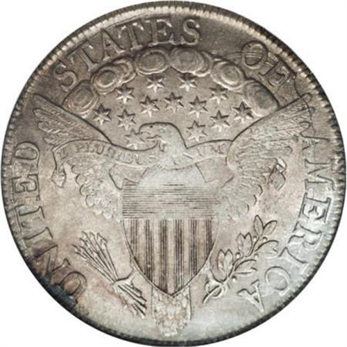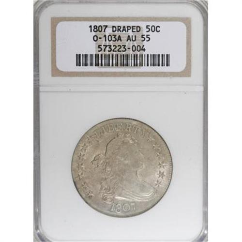 <B>1807 50C Draped Bust AU55 NGC.</B></I> O-103a, R.3. The late die state of O-103 has a crack that curves down to the right from the border to the right top of F, continues through the wing and AMERICA, and then curves to the left to join the claw. The die crack that developed on the obverse during the O-102 marriage is prominent. Don Parsley suggests an interrupted die marriage of O-102 and O-103, stating that the obverse is "usually visible" for both varieties.<BR> Nearly full frosty luster on both sides is accented by pale golden toning. The strike is blunt on the upper head details, and also at the central reverse. A few faint hairlines are visible.<BR> This example ranks at the low end of the Census for O-103, but it appears to be tied for the finest late state piece.<BR> Haseltine-4, Beistle 1A-b, Overton-8, 9, PCGS # 6079, Encyclopedia-4593.<BR><I>Ex: Northeast Numismatics (6/2004).<BR>From The Westmoreland County Collection of Early Bust Halves, 1794-1807.</B></I><BR><BR><B>Coin Engraver:</B> Robert Scot<BR><BR><b>Shipping:</b> Coins & Currency (<a target="_blank" href="http://www.heritageauctions.com/common/shipping.php">view shipping information</a>)