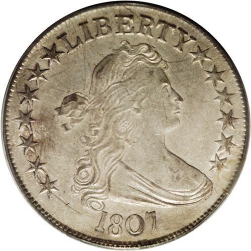 <B>1807 50C Draped Bust AU55 PCGS.</B></I> O-105, R.2. A die lump between the final S of STATES and the O of OF aids attribution of this final year Draped Bust half, as does the 1 in the date joined to the curl, and the beak and star joined point to point. A die crack joins the stars along the left obverse border, as sometimes seen on specimens of this variety. Bright silver surfaces display occasional traces of light tan, and luster in the recessed areas. The design elements exhibit nice delineation, and both faces are quite clean.<BR><BR><b>Shipping:</b> Coins & Currency (<a target="_blank" href="http://www.heritageauctions.com/common/shipping.php">view shipping information</a>)