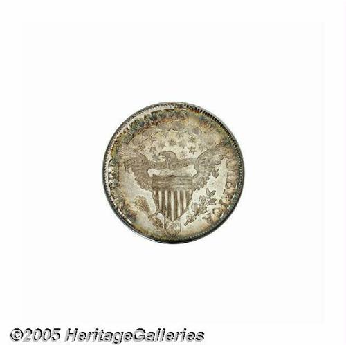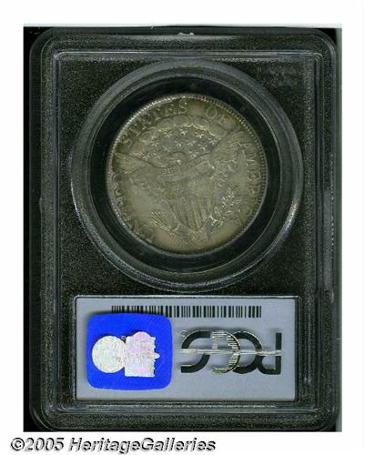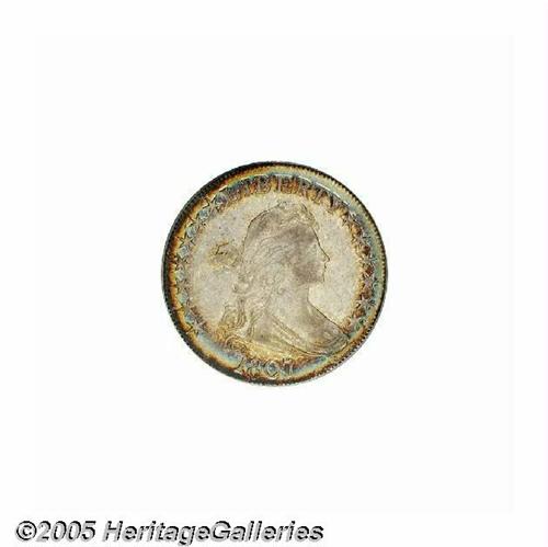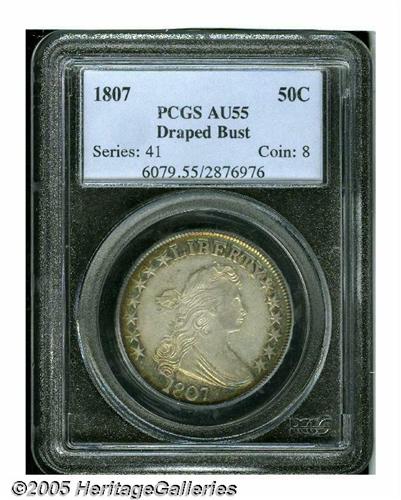 <B>1807<50C> Draped Bust AU55 PCGS.</B></I> O-105, R.2. Golden-brown, lemon, and powder-blue colors dominate the borders of this richly detailed and partly lustrous representative. The eye appeal is impressive, since the surfaces are decidedly clean, and there are no unattractive marks. 1807 was a transitional year for the Half Dollar series, with the new John Reich design replacing the Draped Bust design introduced during Washington's second term.