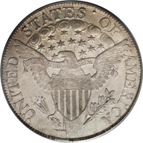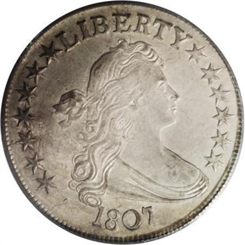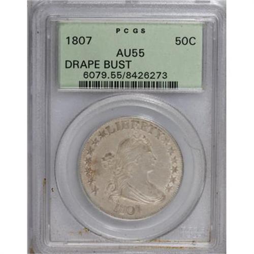 <B>1807 50C Draped Bust AU55 PCGS.</B></I> O-105, R.2. A die lump between the final S of STATES and the O of OF aids attribution of this final year Draped Bust half. Bright silver surfaces display occasional traces of light tan, and luster in the recessed areas. The design elements exhibit nice delineation, and the obverse field has only faint abrasions. In a green label holder.<BR><BR><B>Coin Engraver:</B> Robert Scot<BR><BR><b>Shipping:</b> Coins & Currency (<a target="_blank" href="http://www.heritageauctions.com/common/shipping.php">view shipping information</a>)