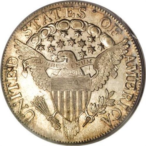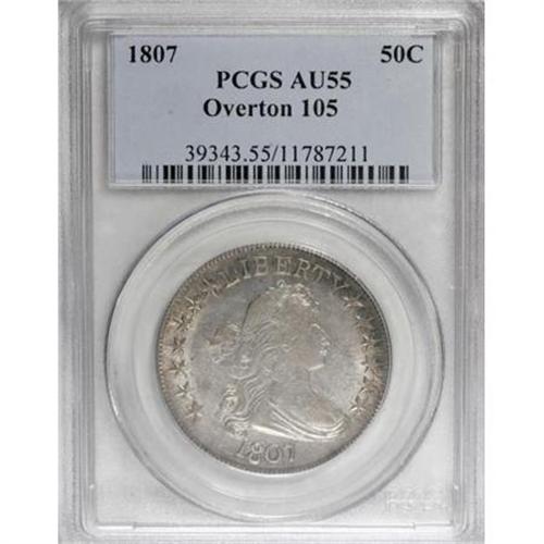 <B>1807 50C Draped Bust AU55 PCGS.</B></I> O-105a, R.1. Both dies of this late state piece have several cracks, including a large reverse break between E and D.<BR> A frosty mint state piece with velvety silver luster and peripheral gold toning. A blunt central strike causes a trace of highpoint wear to be obvious.<BR><B> </B></I>Haseltine-6, Beistle 2-C, Overton-10-13, PCGS # 6079, Encyclopedia-4593.<BR><I>From The Westmoreland County Collection of Early Bust Halves, 1794-1807.</B></I><BR><BR><B>Coin Engraver:</B> Robert Scot<BR><BR><b>Shipping:</b> Coins & Currency (<a target="_blank" href="http://www.heritageauctions.com/common/shipping.php">view shipping information</a>)