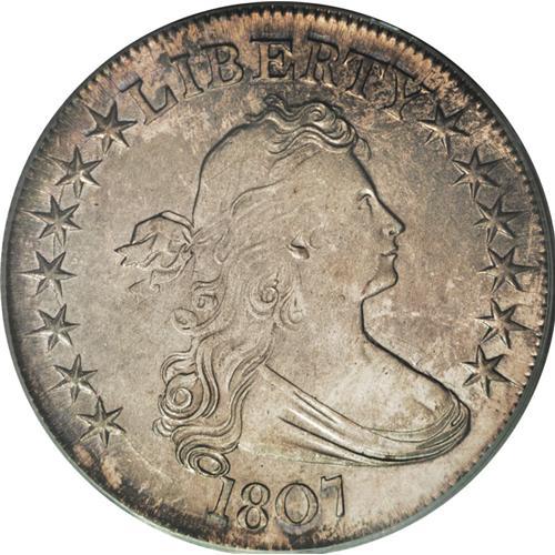 <B>1807 50C Draped Bust AU58 PCGS.</B></I> O-105a, R.4. The scarce late die state with reverse die breaks between ED and S OF. A satiny and smooth olive-gray and pale tan piece with an unusually strong strike for the type. The stars and clouds above the eagle have essentially complete detail. Encased in an older green label holder.<BR><BR><b>Shipping:</b> Coin/Currency (<a target="_blank" href="http://www.heritageauctions.com/common/shipping.php">view shipping information</a>)