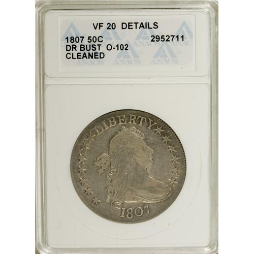 <B>1807 50C Draped Bust--Cleaned--ANACS. VF20 Details.</B></I> O-102, R.2. NGC Census: (156/722). PCGS Population (69/555). Mintage: 301,076. Numismedia Wsl. Price: $325. (#6079)<BR><BR><b>Shipping:</b> Coins & Currency (<a target="_blank" href="http://www.heritageauctions.com/common/shipping.php">view shipping information</a>)