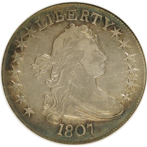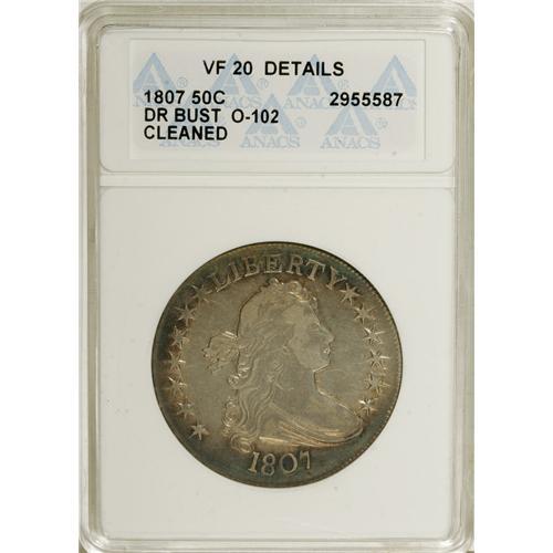 <B>1807 50C Draped Bust--Cleaned--ANACS. VF20 Details.</B></I> O-102. NGC Census: (156/722). PCGS Population (69/555). Mintage: 301,076. Numismedia Wsl. Price: $325. (#6079)<BR><BR><b>Shipping:</b> Coins & Currency (<a target="_blank" href="http://www.heritageauctions.com/common/shipping.php">view shipping information</a>)