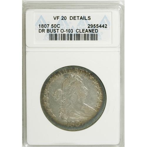 <B>1807 50C Draped Bust--Cleaned--ANACS. VF20 Details.</B></I> O-103. NGC Census: (156/722). PCGS Population (69/555). Mintage: 301,076. Numismedia Wsl. Price: $325. (#6079)<BR><BR><b>Shipping:</b> Coins & Currency (<a target="_blank" href="http://www.heritageauctions.com/common/shipping.php">view shipping information</a>)