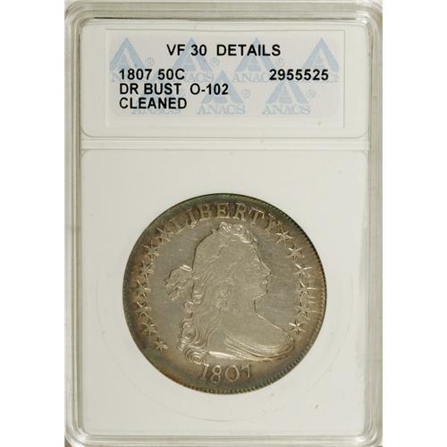 <B>1807 50C Draped Bust--Cleaned--ANACS. VF30 Details.</B></I> O-102. NGC Census: (156/566). PCGS Population (58/437). Mintage: 301,076. Numismedia Wsl. Price: $645. (#6079)<BR><BR><b>Shipping:</b> Coins & Currency (<a target="_blank" href="http://www.heritageauctions.com/common/shipping.php">view shipping information</a>)