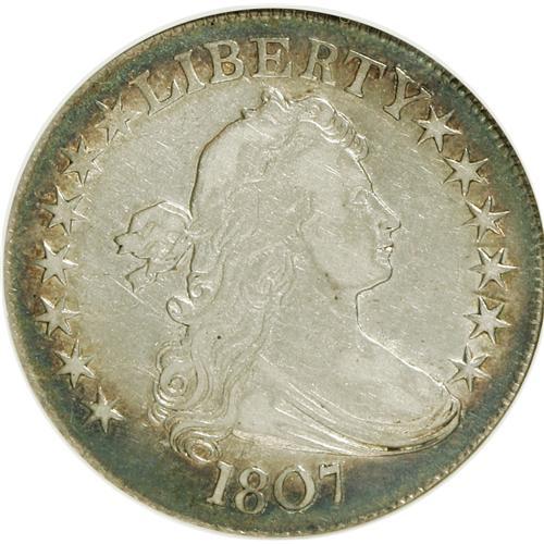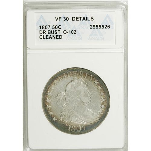 <B>1807 50C Draped Bust--Cleaned--ANACS. VF30 Details.</B></I> O-102. NGC Census: (156/566). PCGS Population (58/437). Mintage: 301,076. Numismedia Wsl. Price: $645. (#6079)<BR><BR><b>Shipping:</b> Coins & Currency (<a target="_blank" href="http://www.heritageauctions.com/common/shipping.php">view shipping information</a>)