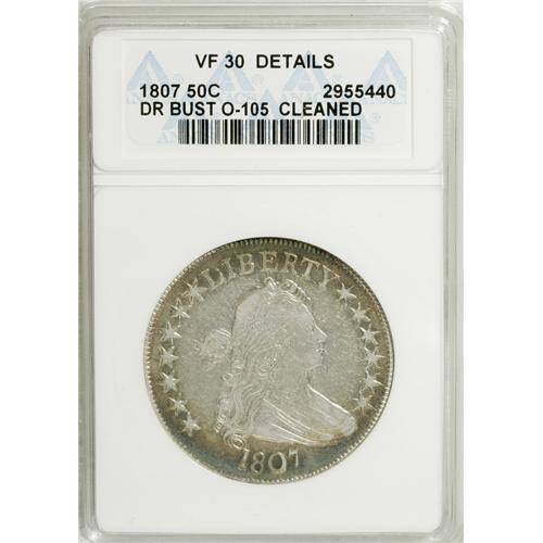 <B>1807 50C Draped Bust--Cleaned--ANACS. VF30 Details.</B></I> O-105. NGC Census: (156/566). PCGS Population (58/437). Mintage: 301,076. Numismedia Wsl. Price: $645. (#6079)<BR><BR><b>Shipping:</b> Coins & Currency (<a target="_blank" href="http://www.heritageauctions.com/common/shipping.php">view shipping information</a>)