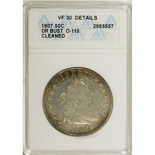 <B>1807 50C Draped Bust--Cleaned--ANACS. VF30 Details.</B></I> O-110. NGC Census: (156/566). PCGS Population (58/437). Mintage: 301,076. Numismedia Wsl. Price: $645. (#6079)<BR><BR><b>Shipping:</b> Coins & Currency (<a target="_blank" href="http://www.heritageauctions.com/common/shipping.php">view shipping information</a>)
