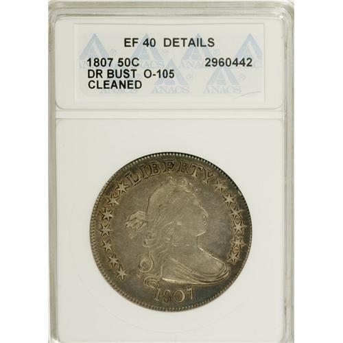 <B>1807 50C Draped Bust--Cleaned--ANACS. XF40 Details.</B></I> O-105, R.1. Deep ocean-blue borders encompass the chestnut-gold fields and stone-gray devices. Mildly subdued, but the faint hairlines are unobtrusive. The obverse edge has a small nick at 2 o'clock.<BR><I>From The Hoosier Discovery Collection.</B></I><BR><BR><b>Shipping:</b> Coins & Currency (<a target="_blank" href="http://www.heritageauctions.com/common/shipping.php">view shipping information</a>)