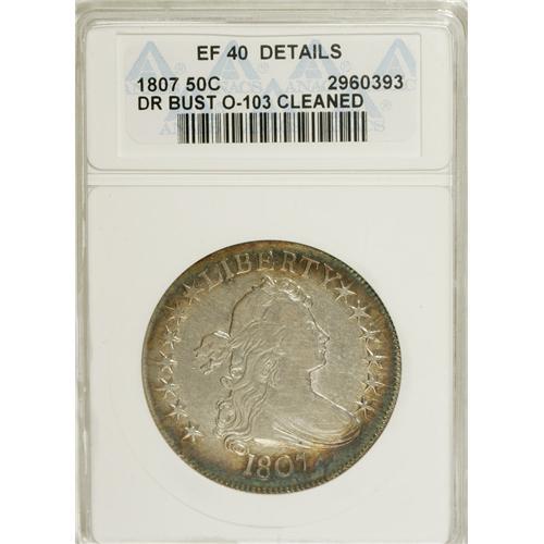 <B>1807 50C Draped Bust--Cleaned--ANACS. XF40 Details.</B></I> O-103, R.3. Aquamarine and autumn-gold enrich the peripheries of this attractively detailed representative. Horizontal slide marks on the portrait suggest a long-ago wipe. Struck from multiply clashed dies.<BR><I>From The Hoosier Discovery Collection.</B></I><BR><BR><b>Shipping:</b> Coins & Currency (<a target="_blank" href="http://www.heritageauctions.com/common/shipping.php">view shipping information</a>)