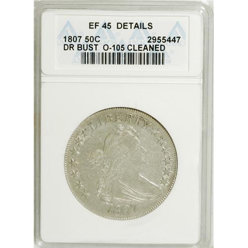 <B>1807 50C Draped Bust--Cleaned--ANACS. XF45 Details.</B></I> O-105. NGC Census: (97/234). PCGS Population (53/256). Mintage: 301,076. Numismedia Wsl. Price: $1,711. (#6079)<BR><BR><b>Shipping:</b> Coins & Currency (<a target="_blank" href="http://www.heritageauctions.com/common/shipping.php">view shipping information</a>)