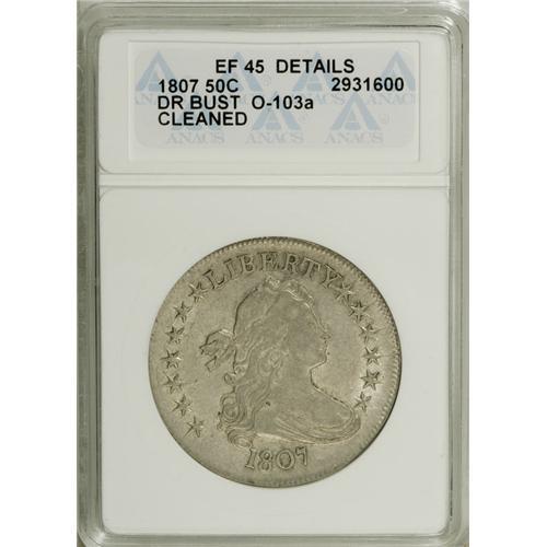 <B>1807 50C Draped Bust--Cleaned--ANACS. XF45 Details.</B></I> O-103a, R.3. Scintillating luster dominates the borders and recessed areas of the devices. Light walnut-brown and gunmetal-blue toning reduce the effect of a mild cleaning.<BR><BR><b>Shipping:</b> Coins & Currency (<a target="_blank" href="http://www.heritageauctions.com/common/shipping.php">view shipping information</a>)