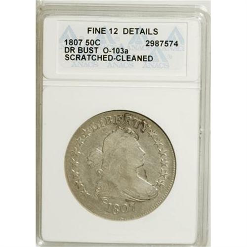 <B>1807 50C Draped Bust--Cleaned, Scratched--ANACS. Fine 12 Details.</B></I> O-103a. NGC Census: (41/602). PCGS Population (26/700). Mintage: 301,076. Numismedia Wsl. Price for NGC/PCGS coin in F12: $225. (#6079)<BR><BR><b>Shipping:</b> Coins & Currency (<a target="_blank" href="http://www.heritageauctions.com/common/shipping.php">view shipping information</a>)