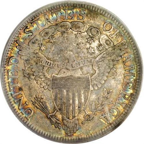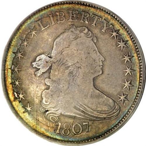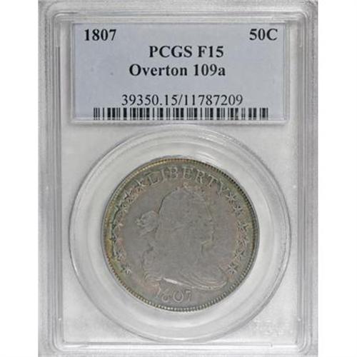 <B>1807 50C Draped Bust Fine 15 PCGS.</B></I> O-109a, R.3. A late state of the obverse, and justifiably deserves to be labeled "O-109b." In fact, that is exactly how it is recorded in Herrman's record of the series. The obverse crack of O-109a now has chips between the outer points of stars 2 and 4, easily visible without magnification.<BR> Probably finer than it is graded, with traces of luster still visible in the protected areas. The usual blunt strike has allowed light wear to result in nearly flat devices. Attractive peripheral iridescence adds to the overall appearance.<BR> There is no accurate Census of this die state available, but Steve Herrman seems to think that only about 10 pieces might exist. He records a single XF40 as the only auction appearance. Once this coin is sold, a valuable addition to auction records will be available.<BR><B> </B></I>Haseltine-10A, Overton-19, PCGS # 6079, Encyclopedia-4593.<BR><I>From The Westmoreland County Collection of Early Bust Halves, 1794-1807.</B></I><BR><BR><B>Coin Engraver:</B> Robert Scot<BR><BR><b>Shipping:</b> Coins & Currency (<a target="_blank" href="http://www.heritageauctions.com/common/shipping.php">view shipping information</a>)