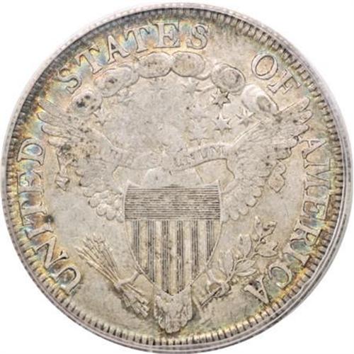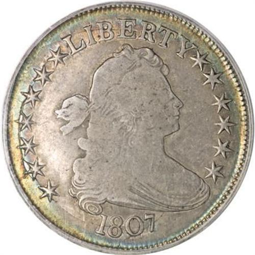 <B>1807 50C Draped Bust Fine 15 PCGS.</B></I> O-109a, R.3. A late state of the obverse, justifiably deserving to be labeled "O-109b." In fact, that is exactly how it is recorded in Herrman's record of the series. The obverse crack of O-109a now has chips between the outer points of stars 2 and 4, easily visible without magnification.<BR> Probably finer than it is graded, with traces of luster still visible in the protected areas. The usual blunt strike has allowed light wear to result in nearly flat devices. Attractive peripheral iridescence adds to the overall appearance.<BR> There is no accurate Census of this die state available, but Steve Herrman seems to think that only about 10 pieces may exist. He records a single XF40 as the only auction appearance. Once this coin is sold, a valuable addition to auction records will be available.<BR><I>From The Westmoreland County Collection of Early Bust Halves, Part Two.</B></I><BR><BR><b>Shipping:</b> Coins & Currency (<a target="_blank" href="http://www.heritageauctions.com/common/shipping.php">view shipping information</a>)