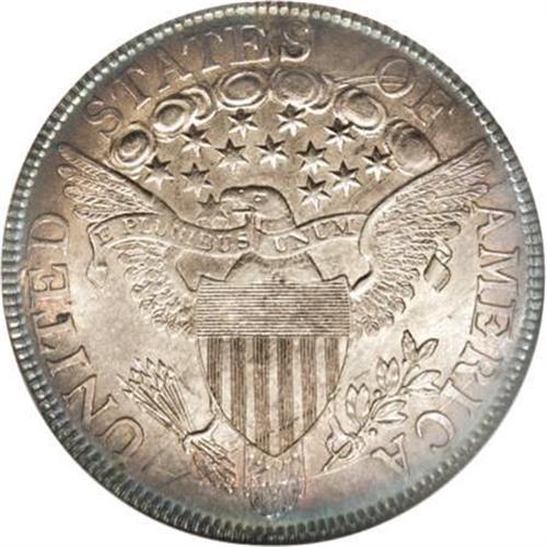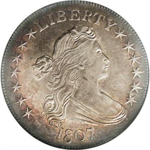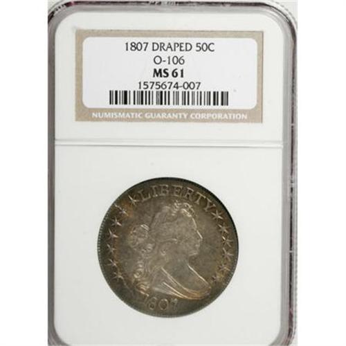 <B>1807 50C Draped Bust MS61 NGC.</B></I> O-106, R.3. The obverse is a later use of Obverse 4, with cracks that are advanced from the O-105a. The reverse was only used for this single die marriage, and has cracks that nearly encircle the die.<BR> Fully lustrous with frosty silver surfaces and vivid peripheral gold, lilac, and blue toning on both sides. The reverse has a tiny rough spot at the final S.<BR> In the middle of the Census, and one of just four Mint State examples of O-106 that are recorded in Steve Herrman's reference. The Overton Census failed to recognize a single Mint State piece.<BR> Haseltine-2, Beistle 2a-D, Overton-15, PCGS # 6079, Encyclopedia-4593.<BR><I>From The Westmoreland County Collection of Early Bust Halves, 1794-1807.</B></I><BR><BR><B>Coin Engraver:</B> Robert Scot<BR><BR><b>Shipping:</b> Coins & Currency (<a target="_blank" href="http://www.heritageauctions.com/common/shipping.php">view shipping information</a>)
