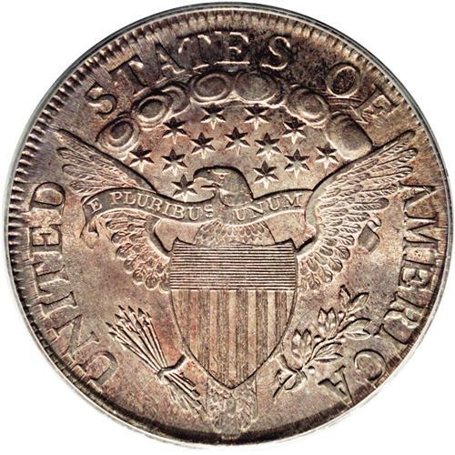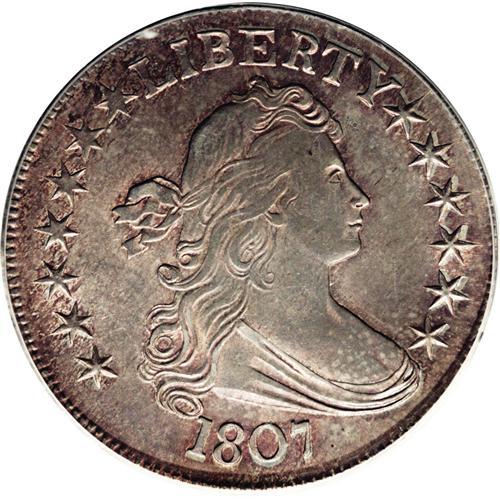 <B>1807<50C> Draped Bust MS62 PCGS.</B></I> O-102, R.2. The variety is attributed by the left serif of the Y in LIBERTY that points well above the top of the T, a small lump (die chip) inside the upper loop of the 8, a leaf that points to the extreme right base of the I in AMERICA, and the eagle's beak being joined to a star point. In the 1990 Overton/Parsley book, the Condition Census of this variety was reported as 55, 55, 50, 45, 45; more recently, Stephen Herrman has noted the public auction appearance of five Mint State examples (65, 64, 63, 63, 63). Accordingly, this MS62 example just misses the lower end of the Condition Census. A delicate mauve-purple and reddish-orange patination overlies a nearly unbroken flow of soft luster. The design elements are generally well defined, except for some softness in the star centers on both sides and in the upper portions of Liberty's hair. A few wispy handling marks are noted on Liberty's cheek.