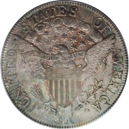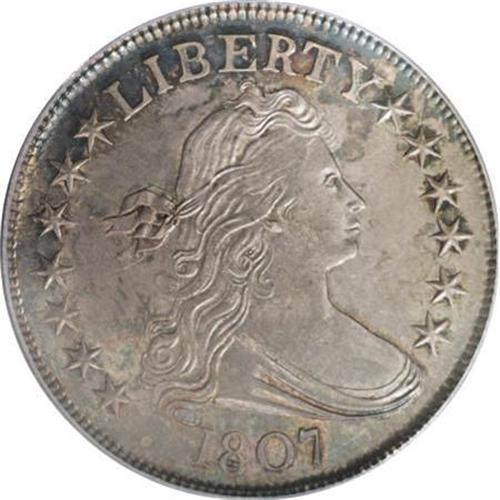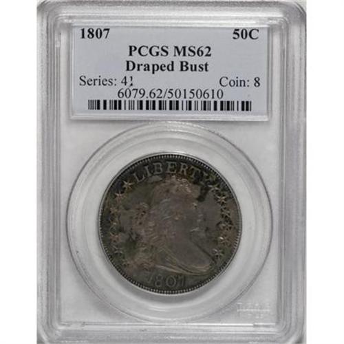 <B>1807 50C Draped Bust MS62 PCGS.</B></I> O-110a, R.3. The Draped Bust type is much scarcer in Mint State than the Capped Bust type. Both designs were struck in the transitional year of 1807. One wonders how Chief Engraver viewed the passing of his Draped Bust type, and its replacement on denomination after denomination by John Reich's motifs. Mottled forest-green and fire-red envelops this smooth example. Sharply struck save for the stars near the beak. Each side has a network of fine die cracks throughout the borders, as described in the Overton standard reference. The lower loop of the 8 has a small letter H. Population: 22 in 62, 32 finer (8/07).<BR><BR><B>Coin Engraver:</B> Robert Scot<BR><BR><b>Shipping:</b> Coins & Currency (<a target="_blank" href="http://www.heritageauctions.com/common/shipping.php">view shipping information</a>)