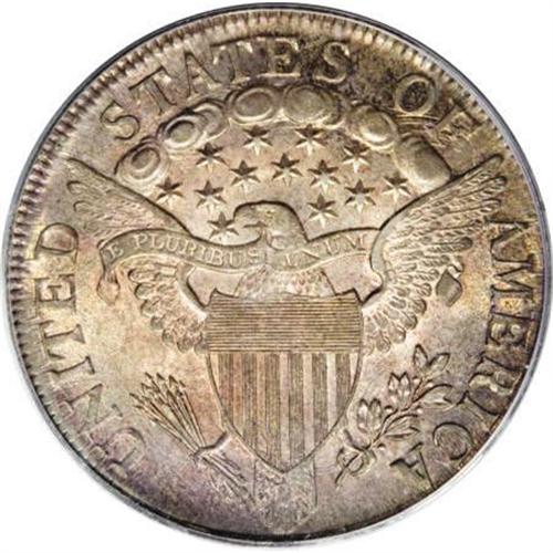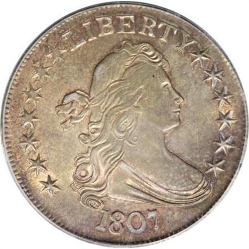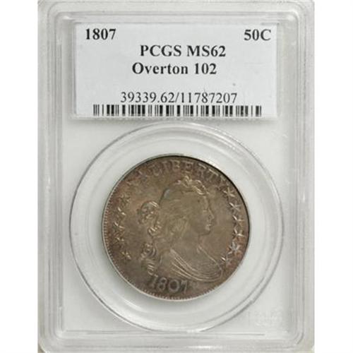 <B>1807 50C Draped Bust MS62 PCGS.</B></I> O-102, R.2. The 102 is the second use of Obverse 2 (first seen on O-101) and first use of Reverse A (used again on O-103). This is an earlier die state that shows only a small lump at the top of the 8 in the date, and just the faintest trace of the die crack from the top of Liberty's head. <BR> This is a surprisingly lustrous coin with a rich overlay of rust-gray toning, the color balanced well from side to side. The obverse shows softness on the hair curls of Liberty and slight weakness on the obverse stars. The reverse, on the other hand, has a remarkably strong strike with complete feather details on the eagle's breast. A few die clash marks are seen, these representing the most obvious ripple in the fabric of the surface of the coin. <BR> A lower Condition Census coin. The finest pieces listed by Stephen Herrman listed as: 65/65, 64,64, 63/63 (2), 62/62. This is that MS62 coin. <BR>Haseltine-2; Beistle 1-A; Overton-3, 4; PCGS# 39339; Encyclopedia-4573.<BR><I>Ex: Atlanta Auction (Heritage, 4/2006), lot 669, where it brought $10,925.<BR>From The Westmoreland County Collection of Early Bust Halves, 1794-1807.</B></I><BR><BR><B>Coin Engraver:</B> Robert Scot<BR><BR><b>Shipping:</b> Coins & Currency (<a target="_blank" href="http://www.heritageauctions.com/common/shipping.php">view shipping information</a>)