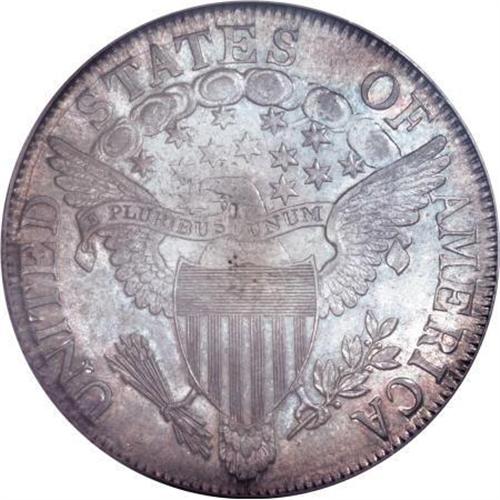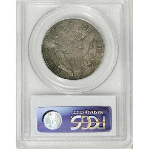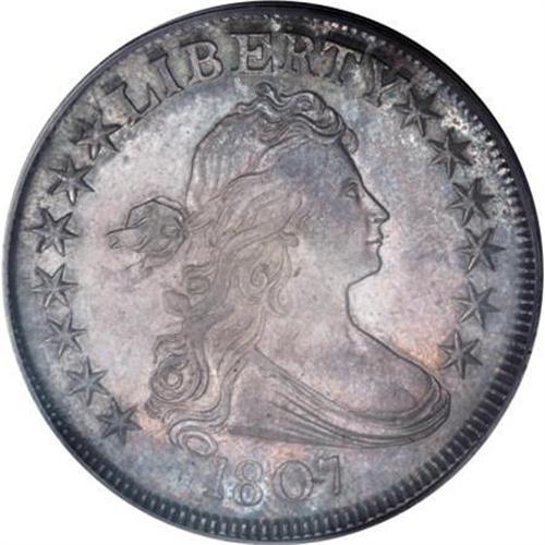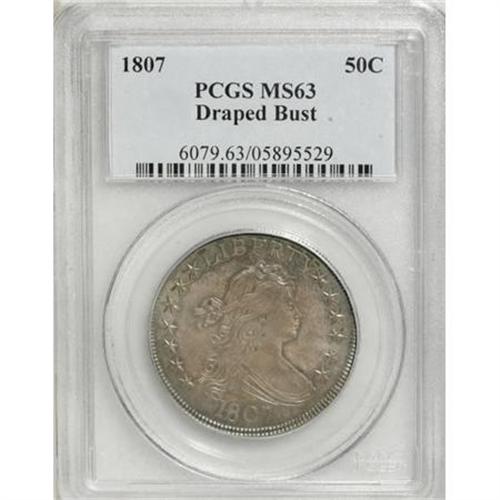 <B>1807 50C Draped Bust MS63 PCGS.</B></I> O-110, R.2. What is immediately apparent about this coin are the multiple die cracks seen on each side. While these are extensive and would appear to represent a later state of the dies, this is in fact an early-intermediate die state. A later state shows even more extensive cracking of both dies. Aside from these mint-made curiosities, the coin itself is originally and attractive toned with deep blue and rose toning over each side. The mint luster is thick and frosted and serves to brighten and enliven the patina. A bit softly struck on Liberty's forecurls and in the center of the reverse, but this is apparently found on most examples as the Overton plate coin shows weakness in the same areas. Several Gems are known of this variety, placing this lower on the Condition Census than one might initially expect.<BR><BR><B>Coin Engraver:</B> Robert Scot<BR><BR><b>Shipping:</b> Coins & Currency (<a target="_blank" href="http://www.heritageauctions.com/common/shipping.php">view shipping information</a>)