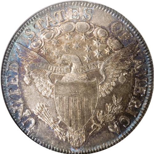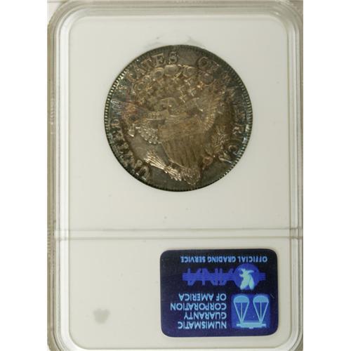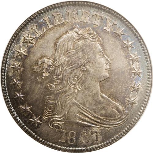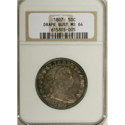 <B>1807 50C Draped Bust MS64 NGC.</B></I> O-110a, R.2. This variety is among the most common of the 11 known 1807 Draped Bust die marriages, an ideal candidate for date or type collectors. Of course, high quality examples such as this near-Gem specimen are not easily located. Probably only about four or five Choice or Gem Mint State examples of the O-110 die marriage exist, in all die states. The extensive peripheral die cracks on both sides indicate that this example is a late die state. A remarkable piece with fully lustrous satin surfaces and excellent design definition. Both sides have pleasing gray-brown surfaces with attractive rose and peripheral blue toning. Census: 18 in 64, 8 finer (12/06) for all 1807 Draped Bust varieties.<BR><BR><b>Shipping:</b> Coins & Currency (<a target="_blank" href="http://www.heritageauctions.com/common/shipping.php">view shipping information</a>)