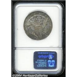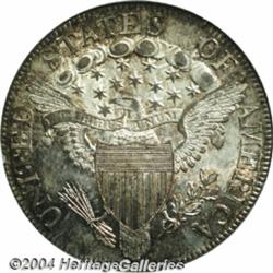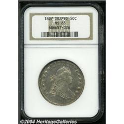 <B>1807<50C> Draped Bust MS65 NGC.</B></I> O-110, R.2. A moderately prooflike Gem with original wisps of golden-brown color on the fields and light pearl-gray patina on the highpoints. A clashmark (as made) is encountered through the cloud near the O in OF. A well preserved type coin that has no abrasions that are remotely worthy of individual mention. Overton-110 features the first star entered low, and the 1 in the date does not touch the curl. A die crack (as produced) wanders from the D in UNITED across the left (facing) wingtip and above STA in STATES. The obverse die crack through the left side stars is present but faint. Overton's condition census is (62, 60, 58, 58, 55). As of (5/04), NGC has certified only 8 examples of 1807 Draped Bust Halves in all varieties as MS65, with just one finer, an Overton-105, as MS66. <BR><BR><B>Important notice:</B> Heritage usually auctions material at the rate of 200-250 lots per hour. On some occasions eBay Live bid software or the Internet may not be able to keep up with the pace of the auction. We recommend placing a realistic absentee bid now as insurance to avoid disappointment. Occasionally the auctioneer may eliminate or reject an eBay Live bid, and the auctioneer may also reopen a lot after the close of the eBay live bidding (usually because we missed an audience bid), and may reject your bid even if it shows you as the winning bidder. By bidding via eBay Live, you agree that Heritage may award the lot to another bidder at its sole discretion under the circumstances described above or any other reasonable circumstances. Since eBay bids are not shown to us until we open the lot on the floor, we treat those bids just like floor bids. In most cases the floor responds before the eBay bid is presented to us, due to Internet lag time, so for consistency we have made it a policy that floor bids are always considered first over tie eBay live bids. Also please note that all Heritage lots purchased through eBay Live carry a 20% Buyer's Premium. Please make sure you read the Terms and Conditions before you bid. </span></font></tr></table></td></tr></table>