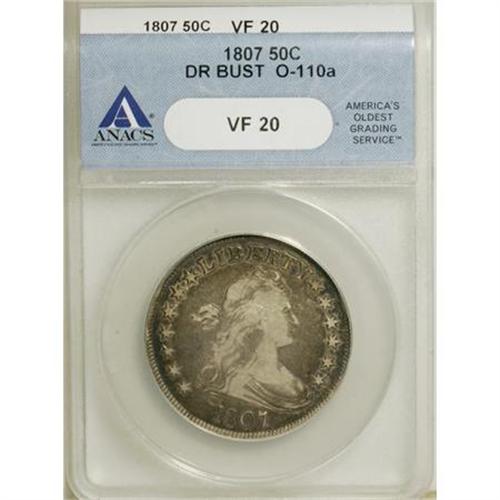 <B>1807 50C Draped Bust VF20 ANACS.</B></I> O-110a. NGC Census: (28/564). PCGS Population (74/607). Mintage: 301,076. Numismedia Wsl. Price for NGC/PCGS coin in VF20: $500. (#6079)<BR><BR><B>Coin Engraver:</B> Robert Scot<BR><BR><b>Shipping:</b> Coins & Currency (<a target="_blank" href="http://www.heritageauctions.com/common/shipping.php">view shipping information</a>)