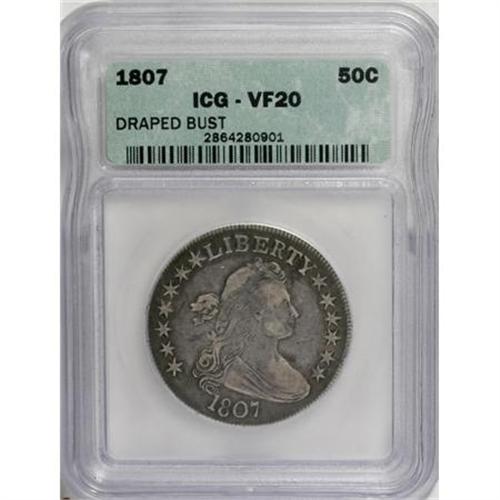 <B>1807 50C Draped Bust VF20 ICG.</B></I> NGC Census: (27/542). PCGS Population (71/564). Mintage: 301,076. Numismedia Wsl. Price for NGC/PCGS coin in VF20: $325. (#6079)<BR><BR><B>Coin Engraver:</B> Robert Scot<BR><BR><b>Shipping:</b> Coins & Currency (<a target="_blank" href="http://www.heritageauctions.com/common/shipping.php">view shipping information</a>\)