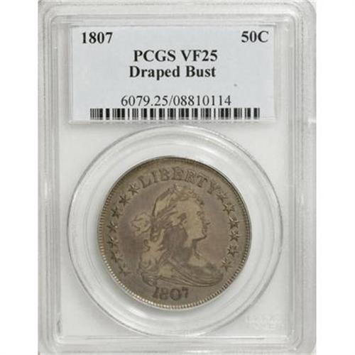 <B>1807 50C Draped Bust VF25 PCGS.</B></I> O-109a, R.2. Both sides show distinguishing die cracks, including one through the date and left stars on the obverse. This moderately worn and appealing piece displays cloud-gray and denim-blue patina with lighter color at the areas of greatest wear. An attractive example of this final Draped Bust half dollar issue.<BR><BR><B>Coin Engraver:</B> Robert Scot<BR><BR><b>Shipping:</b> Coins & Currency (<a target="_blank" href="http://www.heritageauctions.com/common/shipping.php">view shipping information</a>)