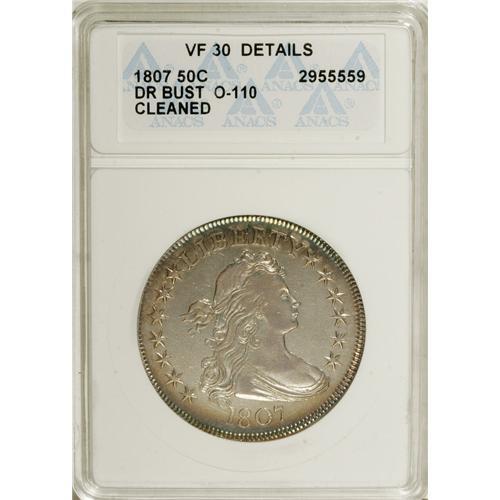 <B>1807 50C Draped Bust--Cleaned--ANACS. VF30 Details.</B></I> O-110. NGC Census: (156/566). PCGS Population (58/437). Mintage: 301,076. Numismedia Wsl. Price: $645. (#6079)<BR><BR><b>Shipping:</b> Coins & Currency (<a target="_blank" href="http://www.heritageauctions.com/common/shipping.php">view shipping information</a>)