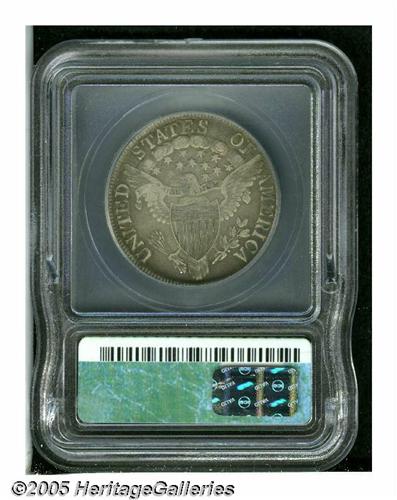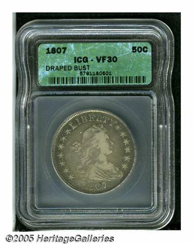 <B>1807<50C> Draped Bust VF30 ICG.</B></I> O-110a, R.3. Electric-blue, peach, and stone-gray toning endows this unmarked and evenly circulated representative. The final year of the Draped Bust motif.