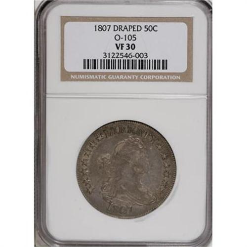 <B>1807 50C Draped Bust VF30 NGC.</B></I> O-105, R.1. Glimpses of mint luster emerge from this cream-gray final-year Draped Bust half. An interesting lintmark curls through the Y in LIBERTY, three broad faded marks reside near the arrows, and a few thin field marks are noted near the chin.<BR><I>From The Parker Lee III Collection.</B></I><BR><BR><B>Coin Engraver:</B> Robert Scot<BR><BR><b>Shipping:</b> Coins & Currency (<a target="_blank" href="http://www.heritageauctions.com/common/shipping.php">view shipping information</a>)