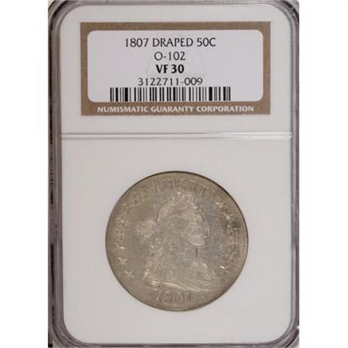 <B>1807 50C Draped Bust VF30 NGC.</B></I> O-102, R.2. This lightly toned final-year Draped Bust half has more than its share of remaining luster. A faint vertical mark is noted near the profile.<BR><BR><B>Coin Engraver:</B> Robert Scot<BR><BR><b>Shipping:</b> Coins & Currency (<a target="_blank" href="http://www.heritageauctions.com/common/shipping.php">view shipping information</a>)