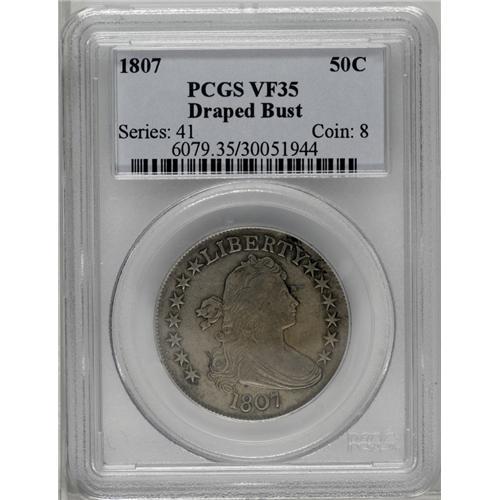 <B>1807<50C> Draped Bust VF35 PCGS.</B></I> O-102, R.2. This cream-gray final-year Draped Bust half is richly detailed for the grade, and the only noticeable mark is a short line in front of Liberty's forehead. Minor verdigris above the T in LIBERTY is accompanied by light abrasions. <BR><BR><B>Important notice:</B> Heritage usually auctions material at the rate of 200-250 lots per hour. On some occasions eBay Live bid software or the Internet may not be able to keep up with the pace of the auction. We recommend placing a realistic absentee bid now as insurance to avoid disappointment. Occasionally the auctioneer may eliminate or reject an eBay Live bid, and the auctioneer may also reopen a lot after the close of the eBay live bidding (usually because we missed an audience bid), and may reject your bid even if it shows you as the winning bidder. By bidding via eBay Live, you agree that Heritage may award the lot to another bidder at its sole discretion under the circumstances described above or any other reasonable circumstances. Since eBay bids are not shown to us until we open the lot on the floor, we treat those bids just like floor bids. In most cases the floor responds before the eBay bid is presented to us, due to Internet lag time, so for consistency we have made it a policy that floor bids are always considered first over tie eBay live bids. Also please note that all Heritage lots purchased through eBay Live carry a 20% Buyer's Premium. Please make sure you read the Terms and Conditions before you bid. This lot is being auctioned in conjunction with a live floor auction by Heritage Galleries & Auctioneers. All final auction and invoice information will be supplied by Heritage Galleries & Auctioneers, and all other information should be considered preliminary. Lot:1931 <BR><BR><B>Winning Notification and Billing:</B> After the FINAL session in this auction is complete, Heritage will send e-mail and snail mail invoices. This process normally takes several days. All final auction and invoice information will be supplied by Heritage Galleries & Auctioneers, and all other information should be considered preliminary. <BR><BR>This auction will be conducted on a live auction floor and over the Internet through eBay Live. If you choose to place an absentee bid, please take a moment to <font color='#0000ff'><u><a href='http://pages.ebay.com/liveauctions/help/before/laabsentee.html'>learn how eBay Live absentee bidding works</a></u></font><font color='#000000'>