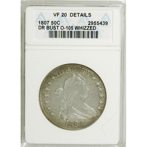 <B>1807 50C Draped Bust--Whizzed--ANACS. VF20 Details.</B></I> O-105. NGC Census: (156/722). PCGS Population (69/555). Mintage: 301,076. Numismedia Wsl. Price: $325. (#6079)<BR><BR><b>Shipping:</b> Coins & Currency (<a target="_blank" href="http://www.heritageauctions.com/common/shipping.php">view shipping information</a>)