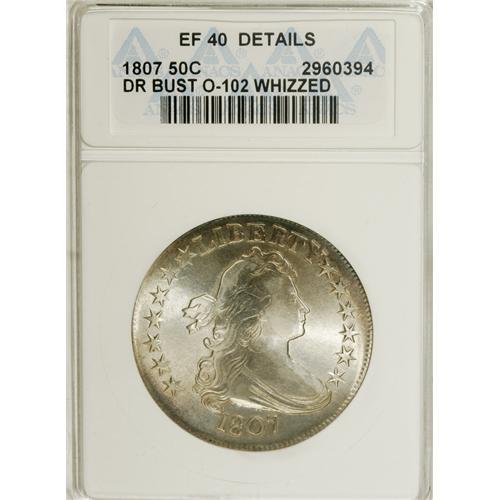 <B>1807 50C Draped Bust--Whizzed--ANACS. XF40 Details.</B></I> O-102. NGC Census: (80/331). PCGS Population (80/309). Mintage: 301,076. Numismedia Wsl. Price: $1,125. (#6079)<BR><BR><b>Shipping:</b> Coins & Currency (<a target="_blank" href="http://www.heritageauctions.com/common/shipping.php">view shipping information</a>)