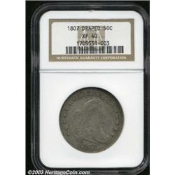 <TABLE cellSpacing=0 cellPadding=0 width="100%" bgColor=#000000 border=0><TBODY><TR><TD width="100%"><TABLE cellSpacing=1 cellPadding=3 width="100%" border=0><TBODY><TR><TD width="100%" bgColor=#79735c><FONT face=arial color=#ffffff size=3><B>Description</B> </FONT></TD></TR><TR><TD width="100%" bgColor=#ffffff><FONT face=arial size=2><B>1807 50C Draped Bust XF40 NGC.</B></I> O-105, R.2. E PLURIBUS UNUM is fully legible, and the eagle and lower hair tresses are bold for the grade. The upper left obverse field has a trio of faded abrasions, but the dusky dove-gray surfaces are generally pleasing. </FONT></TD></TR></TBODY></TABLE></TD></TR></TBODY></TABLE><BR><A name=PricesRealized></A><TABLE cellSpacing=0 cellPadding=0 width="100%" bgColor=#000000 border=0><TBODY><TR><TD width="100%"><TABLE cellSpacing=1 cellPadding=3 width="100%" border=0><TBODY><TR><TD width="100%" bgColor=#79735c><A name=PR><FONT face=arial color=#ffffff size=3><B>Previous Prices from Heritage Auctions</B> </FONT></A></TD></TR><TR><TD bgColor=#f6f6ed><TABLE cellSpacing=0 cellPadding=0 width="100%" border=1><TBODY><TR><TD align=middle width="33%"><B>Date</B></TD><TD align=middle width="33%"><B>Service</B></TD><TD align=middle width="33%"><B>Price</B></TD></TR><TR bgColor=whitesmoke><TD width="33%"><B>08/17/1996</B></TD><TD width="33%">PCGS</TD><TD width="33%">$522.50</TD></TR><TR bgColor=whitesmoke><TD width="33%"><B>11/12/2002</B></TD><TD width="33%">NGC</TD><TD width="33%">$586.50</TD></TR><TR bgColor=whitesmoke><TD width="33%"><B>01/05/2001</B></TD><TD width="33%">NGC</TD><TD width="33%">$632.50</TD></TR><TR bgColor=whitesmoke><TD width="33%"><B>01/11/1997</B></TD><TD width="33%">NGC</TD><TD width="33%">$546.25</TD></TR><TR bgColor=whitesmoke><TD width="33%"><B>07/15/2003</B></TD><TD width="33%">NGC</TD><TD width="33%">$661.25</TD></TR><TR bgColor=whitesmoke><TD width="33%"><B>03/22/1997</B></TD><TD width="33%">ANACS</TD><TD width="33%">$253.00</TD></TR><TR bgColor=whitesmoke><TD width="33%"><B>05/03/2003</B></TD><TD width="33%">ANACS</TD><TD width="33%">$920.00</TD></TR></TBODY></TABLE></TD></TR><TR><TD bgColor=#ffffff><FONT face=arial size=1 ?>PLEASE NOTE: All prices realized reflect the final hammer price PLUS the buyer's premium in auctions that charge a buyer's premium. Each item has a notation at the top of the listing indicating whether that lot included a buyer's premium. Example: A item that sells with a final hammer price of $100 and a 20% buyer's premium will display with a price realized of $120. All information listed is intended to be as accurate as possible, but errors are possible. Please use this guide carefully and inform us of any inaccuracies. </FONT></TD></TR></TBODY></TABLE></TD></TR></TBODY></TABLE><BR><TABLE cellSpacing=0 cellPadding=0 width="100%" bgColor=#000000 border=0><TBODY><TR><TD width="100%"><TABLE cellSpacing=1 cellPadding=3 width="100%" border=0><TBODY><TR><TD width="100%" bgColor=#79735c colSpan=6><FONT face=arial color=#ffffff size=3><B>Price Guide*</B> </FONT></TD></TR><TR bgColor=#f6f6ed><TD align=middle><B>Grade</B> </TD><TD align=middle><B>Coin World<BR>(Trends)</B> </TD><TD align=middle><B>Numismedia<BR>Retail</B> </TD><TD align=middle><B>Numismedia<BR>Wholesale</B> </TD><TD align=middle><B>Coin<BR>Universe</B> </TD><TD align=middle><B>Heritage<BR>Value Index</B> </TD></TR><TR bgColor=#ffffff><TD align=middle>35</TD><TD align=right>---</TD><TD align=right>---</TD><TD align=right>---</TD><TD align=right>---</TD><TD align=right>$489.06</TD></TR><TR style="FONT-WEIGHT: bold" bgColor=#cccfdd><TD align=middle>40</TD><TD align=right>$750.00</TD><TD align=right>---</TD><TD align=right>---</TD><TD align=right>$800.00</TD><TD align=right>$571.75</TD></TR><TR bgColor=#ffffff><TD align=middle>45</TD><TD align=right>$1,000.00</TD><TD align=right>---</TD><TD align=right>---</TD><TD align=right>---</TD><TD align=right>$910.04</TD></TR><TR bgColor=#ffffff><TD colSpan=6><FONT size=1>*All information listed is intended to be as accurate as possible, but errors are possible. No item may be returned or refused based on this information which is provided as a service to our customers. You should contact each pricing source directly to determine the accuracy of this information. </FONT></TD></TR></TBODY></TABLE></TD></TR></TBODY></TABLE><BR><TABLE cellSpacing=0 cellPadding=0 width="100%" bgColor=#000000 border=0><TBODY><TR><TD width="100%"><TABLE cellSpacing=1 cellPadding=3 width="100%" border=0><TBODY><TR><TD width="100%" bgColor=#79735c><FONT face=arial color=#ffffff size=3><B>Population Guide</B> </FONT></TD></TR><TR bgColor=#ffffff><TD align=middle><!-- Begin Output of Population Grid--><TABLE cellSpacing=0 cellPadding=0 width="100%" border=0><TBODY><TR><TD vAlign=center><TABLE cellSpacing=0 width="100%" border=1 cellsadding="3"><TBODY><TR><TD vAlign=center><TABLE cellSpacing=0 cellPadding=3 width="100%" border=1><TBODY><TR><TD vAlign=center align=middle bgColor=#f0f1e8 colSpan=2 <CENTER><FONT face=Arial size=2><B>PCGS Pop </B></FONT><CENTER></CENTER></TD><TD vAlign=center align=middle bgColor=#f0f1e8 colSpan=2><CENTER><FONT face=Arial size=2><B>NGC Pop</B></CENTER></FONT></TD></TR><TR><TD vAlign=center><FONT face=Arial size=2>(40)</FONT> </TD><TD vAlign=center align=right><FONT face=Arial size=2>53</FONT> </TD><TD vAlign=center><FONT face=Arial size=2>(40)</FONT> </TD><TD vAlign=center align=right><FONT face=Arial size=2>55</FONT> </TD></TR><TR><TD vAlign=center><FONT face=Arial size=2>(>40)</FONT> </TD><TD vAlign=center align=right><FONT face=Arial size=2>248</FONT> </TD><TD vAlign=center><FONT face=Arial size=2>(>40)</FONT> </TD><TD vAlign=center align=right><FONT face=Arial size=2>254</FONT> </TD></TR></TBODY></TABLE></TD></TR></TBODY></TABLE></TD></TR></TBODY></TABLE><!-- End Output of Population Grid--> Important notice: Heritage usually auctions material at the rate of 200-250 lots per hour. On some occasions eBay Live bid software or the Internet may not be able to keep up with the pa