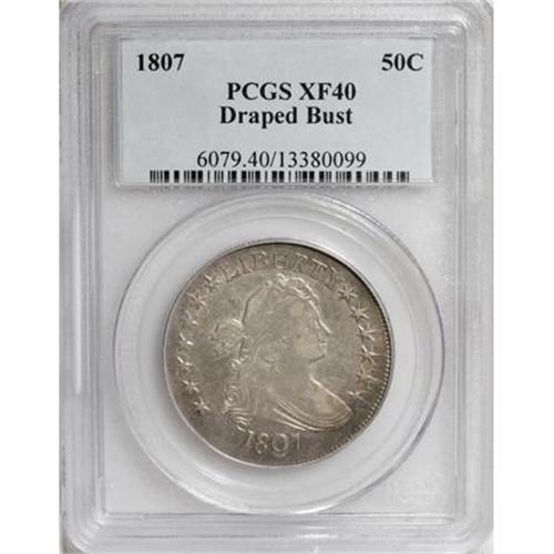 <B>1807 50C Draped Bust XF40 PCGS.</B></I> O-103a, R.3. A late state piece with light clash marks on each side, and clearly evident die cracks on the reverse. A fine die crack extends from the top of F to the right wing and through AMER. Additional cracks are visible through UNITED STATE with a die chip left of the first S.<BR> This delightful example has pleasing ivory luster with light amber toning that is framed by peripheral iridescence. A few scattered marks are consistent with the grade, but the overall appearance is excellent.<BR><I>From The Westmoreland County Collection of Early Bust Halves, Part Two.</B></I><BR><BR><b>Shipping:</b> Coins & Currency (<a target="_blank" href="http://www.heritageauctions.com/common/shipping.php">view shipping information</a>)