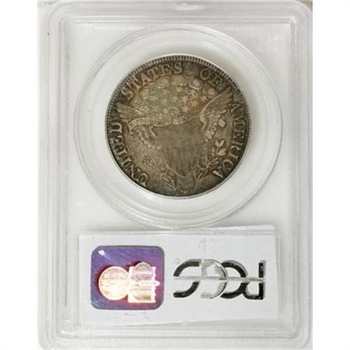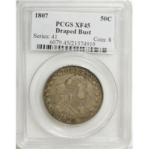 <B>1807 50C Draped Bust XF45 PCGS.</B></I> O-103, R.3. Struck from a heavily worn obverse die and a reverse die that also exhibits wear, though the die cracks though the reverse legends that identify the O-103a variety are absent. The centers of this lightly worn, still-lustrous coin are silver-gray with a touch of denim-blue, while the margins have lovely gold-green and orange patina.<BR><BR><B>Coin Engraver:</B> Robert Scot<BR><BR><b>Shipping:</b> Coins & Currency (<a target="_blank" href="http://www.heritageauctions.com/common/shipping.php">view shipping information</a>\)