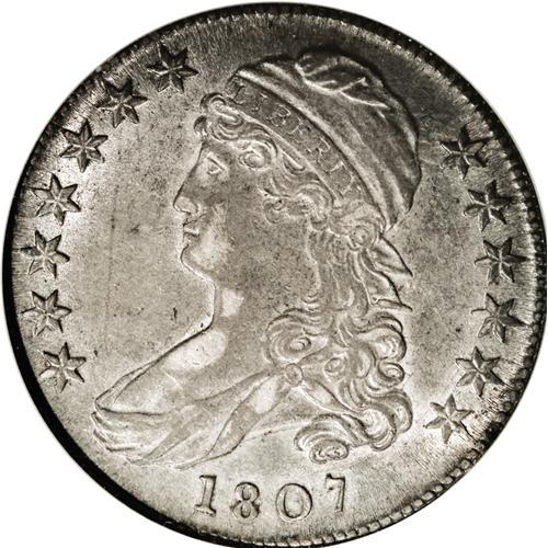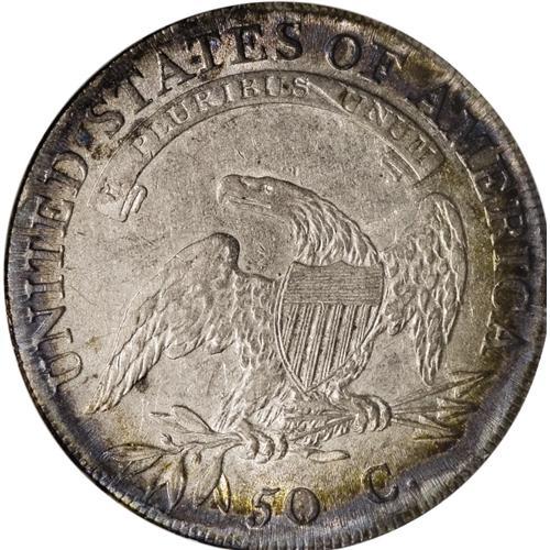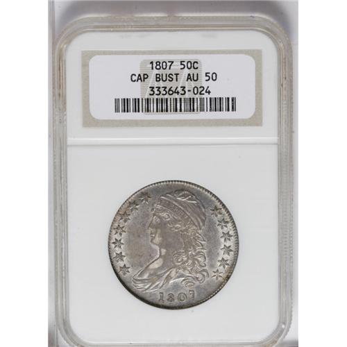 <B>1807<50C> Large Stars, 50 Over 20 AU50 NGC.</B></I> O-112, R.1. Rose-tan toning covers the obverse, while the mostly silver-gray reverse shows deep burgundy and cobalt-blue highlights in the peripheries. A number of light spots of wear are visible, consistent with the grade, but virtually all of the detail is intact. A considerable amount of frosty luster remains amid the stars and the recessed areas of the devices.