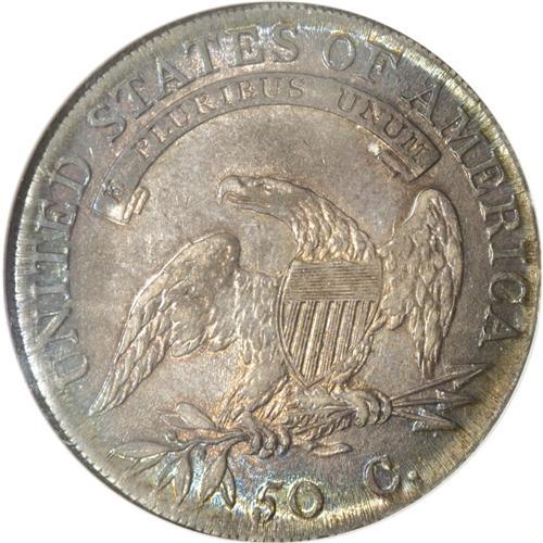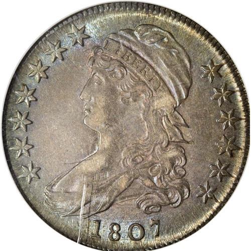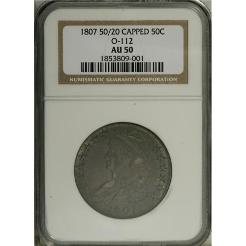 <B>1807 50C Large Stars, 50 Over 20 AU50 NGC.</B></I> O-112, R.1. The Overton Reverse H with the 50/20 is shared with another famous obverse, that for the "Bearded Goddess" O-111 variety. On this obverse, star 1 points between segments, however, and in late states, as here, a die crack runs beneath the date and joins the 80. Light rub fails to limit the expansive eye appeal, with lustrous surfaces, deep lilac centers, and steel-blue rims.<BR><BR><b>Shipping:</b> Coin/Currency (<a target="_blank" href="http://www.heritageauctions.com/common/shipping.php">view shipping information</a>)