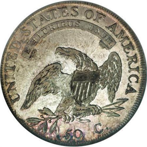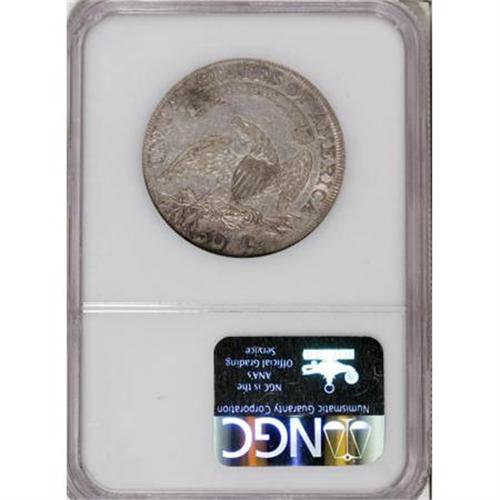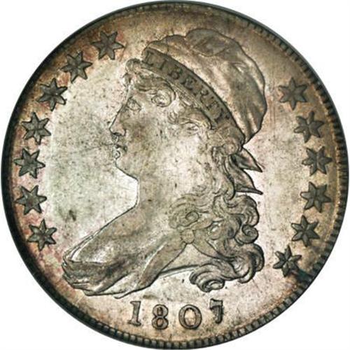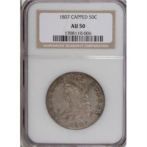 <B>1807 50C Large Stars, 50 Over 20 AU50 NGC.</B></I> O-112, R.1. Lightly toned pearl-gray with hints of rose and cobalt-blue at the margins. Luster emerges from protected areas, and the surfaces have only faint marks. The more available of two die marriages that share the popular blundered denomination reverse.<BR><BR><B>Coin Engraver:</B> John Reich<BR><BR><b>Shipping:</b> Coins & Currency (<a target="_blank" href="http://www.heritageauctions.com/common/shipping.php">view shipping information</a>)