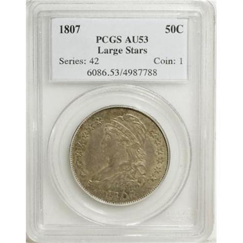 <B>1807 50C Capped Bust, Small Stars AU53 PCGS.</B></I> O-113a, R.3. The sole Small Stars die marriage. Incorrectly designated as a Large Stars variety by PCGS. Orange, olive, and steel-gray embrace this surprisingly unblemished example. The centers are typically brought up, although the stars and other peripheral elements are sharp.<BR><BR><B>Coin Engraver:</B> John Reich<BR><BR><b>Shipping:</b> Coins & Currency (<a target="_blank" href="http://www.heritageauctions.com/common/shipping.php">view shipping information</a>)