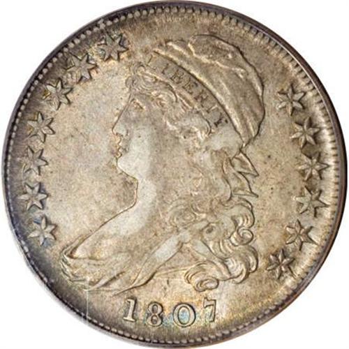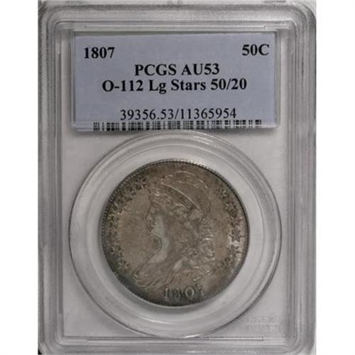 <B>1807 50C Large Stars, 50 Over 20 AU53 PCGS.</B></I> O-112, R.1. A band of luster fills the margins of this golden-gray and ice-blue representative. Impressively free from abrasions. Slightly granular near the left scroll end. The popular blundered die variety where the engraver began to enter the denomination as 25C before recognizing his mistake.<BR><BR><B>Coin Engraver:</B> John Reich<BR><BR><b>Shipping:</b> Coins & Currency (<a target="_blank" href="http://www.heritageauctions.com/common/shipping.php">view shipping information</a>)