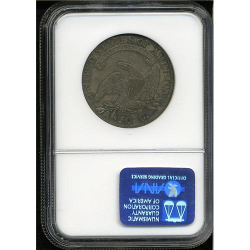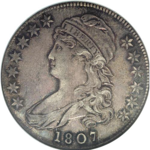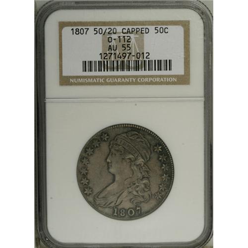 <B>1807 50C Large Stars, 50 Over 20 AU55 NGC.</B></I> O-112, R.1. This is the popular variety with portions of a 2 visible beneath the 5 in the denomination. Apparently a mint worker either mistook a 2 punch for a 5 punch, or thought he was working on a quarter before realizing the error. Deep gray toning fades to charcoal near the peripheries of the obverse, while the reverse displays multicolored hues over medium ivory-silver toning.<BR><BR><b>Shipping:</b> Coin/Currency (<a target="_blank" href="http://www.heritageauctions.com/common/shipping.php">view shipping information</a>)